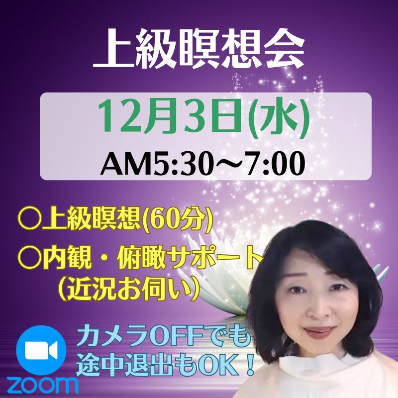 「上級瞑想会」は、2025年4月以降に「上級瞑想マスター講座」を受講または再受講された方に、ご都合のつく「上級瞑想会」に1年間に何回でも参加できる「年間フリーパス」が含まれています。「上級瞑想会」は月に3〜4回回際しており、日曜祝日の朝7:00〜8:30amまたは平日5:30〜7:00amにZoomで、毎回のお申込不要でカメラOFFでご参加頂けるようになっています。また期限が切れた際には11,000円(税込)で「上級瞑想会 年間フリーパス」をお申込・ご購入頂ければ引き続きご利用いただけます。
