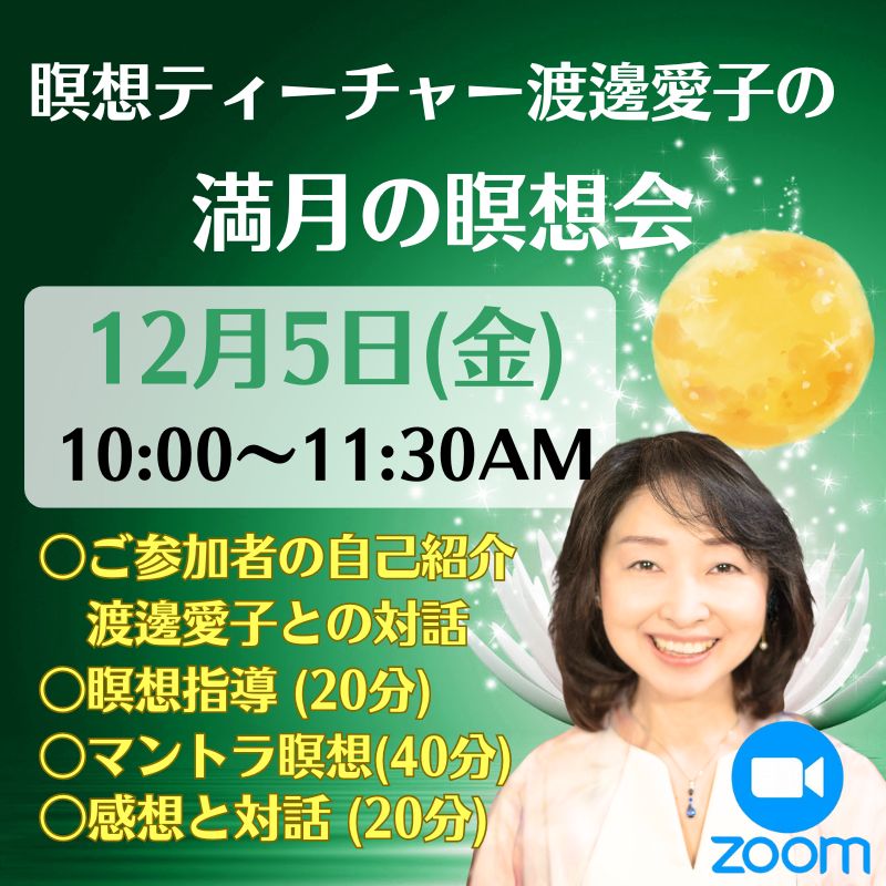 渡邊愛子の各種Zoom瞑想会では瞑想指導歴19年の経験をベースに、初心者の方から熟練者の方まで、各自の状況やニーズに合わせながら瞑想の指導やご質問に答えさせて頂きます。